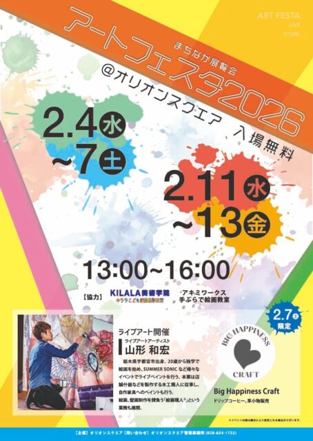 オリオンスクエアを会場に開催される、まちなか展覧会。期間中は、街の中でアート作品に触れられる展示が行われ、日常の延長でアートを楽しめる空間が広がります。開催期間の一部日程では、ライブアートパフォーマンスや物販も実施され、作品鑑賞とあわせて多彩な楽しみ方が用意されています。