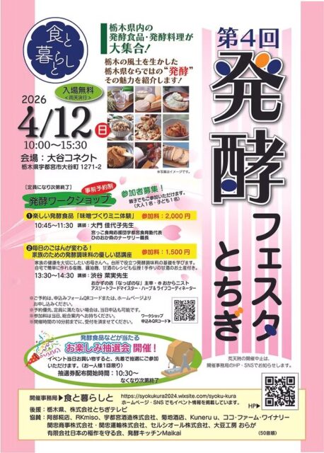 栃木県宇都宮市で4月に開催される発酵イベントとして、大谷コネクトを会場に実施される食と暮らしと ー 第4回 発酵フェスタ とちぎ ーは、栃木県内の発酵食品・発酵料理の紹介や発酵調味料ワークショップが行われる催しです。