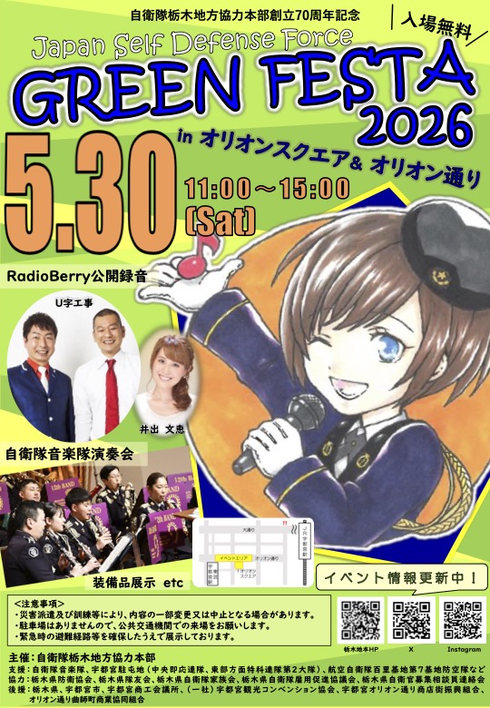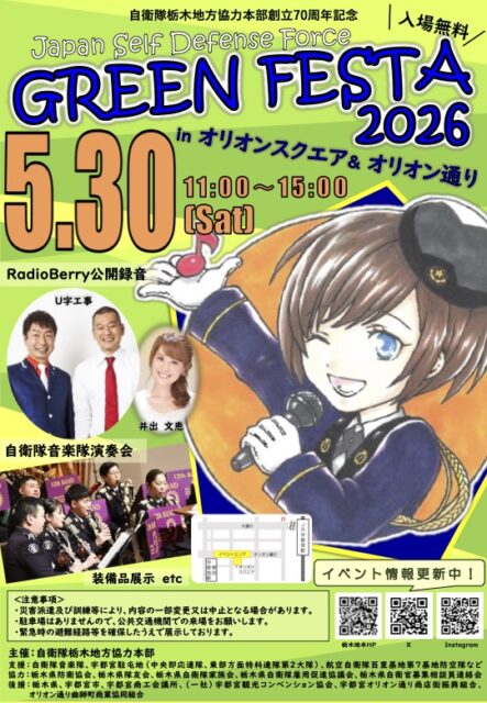 宇都宮で5月に開催される自衛隊イベントとして、オリオンスクエア、オリオン通りを会場に実施される自衛隊グリーンフェスタ 2026は、自衛隊音楽隊による音楽演奏や装備品展示などが行われる催しです。