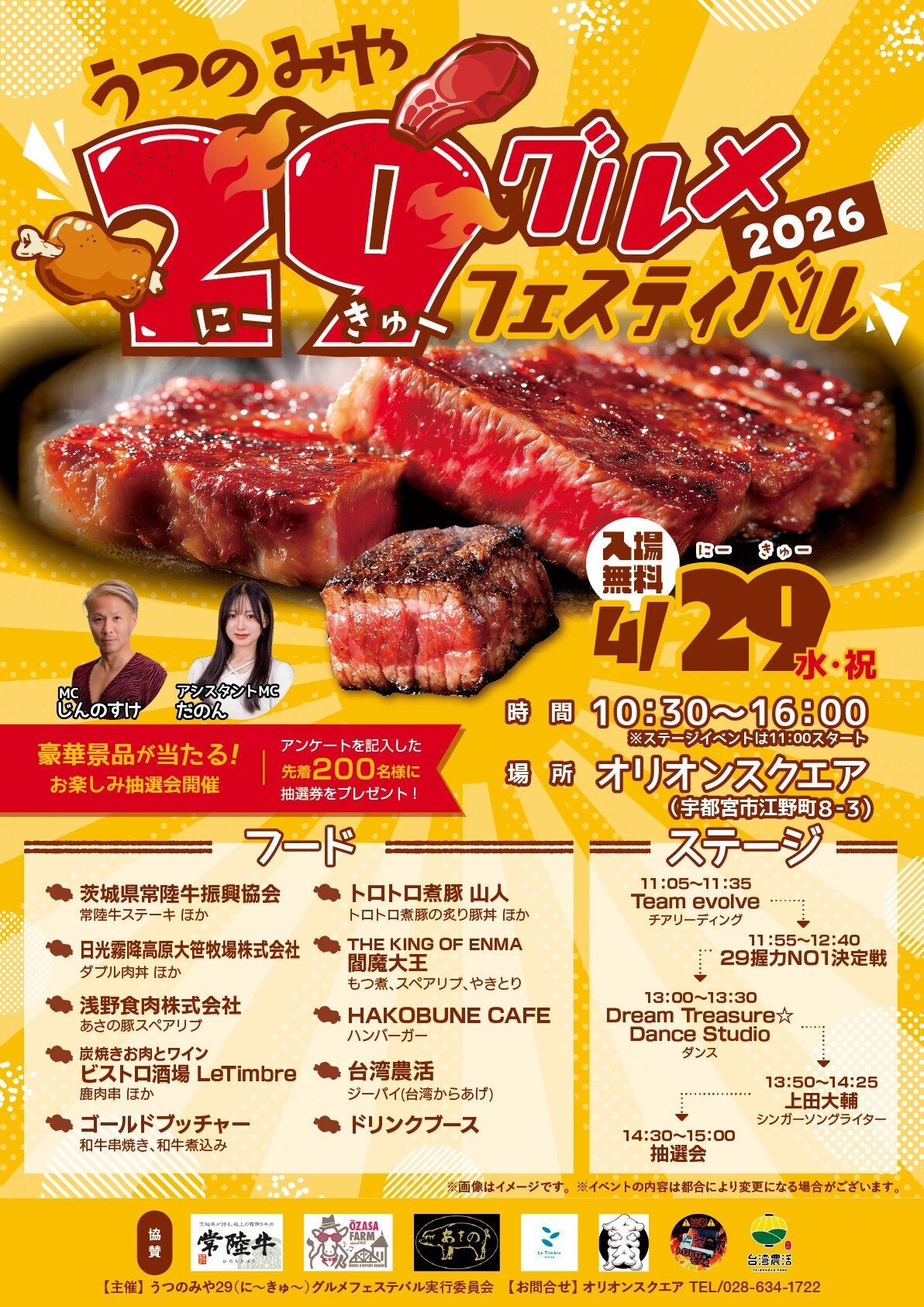 うつのみや29グルメフェスティバル2026は、肉料理を中心とした飲食ブースとステージ企画が展開されるイベントです。複数の出店者によるフード販売とパフォーマンスが一日を通して実施されます。